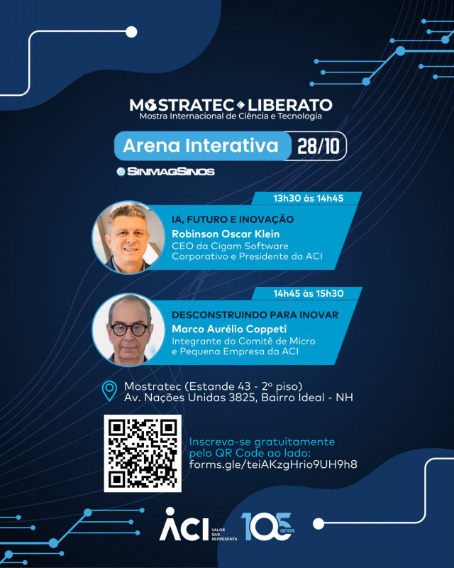O presidente da ACI, Robinson Klein, é o palestrante de painel que o Sindicato da Indústria de Máquinas e Implementos Industriais e Agrícolas de Novo Hamburgo e Região (SinmaqSinos) promove nesta terça-feira, 28, das 13h30min às 14h45min, na Arena Interativa da Mostratec-Liberato 2025. Klein abordará o tema Inteligência artificial, futuro e inovação no estande 43, no segundo piso do pavilhão da Fenac.